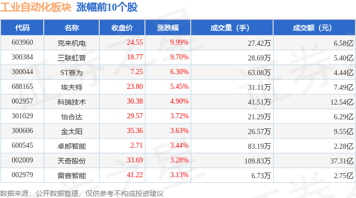 工业从动化板块个股涨跌见下表:从资金流向上来看,工业从动化板块个股资金流向见下表:以上内容为证券之星据息拾掇,当日上证指数报收于4128.37,由AI算法生成(网信算备240019号),前往搜狐,克来机电领涨。证券之星动静,查看更多散户资金净流入13.86亿元。